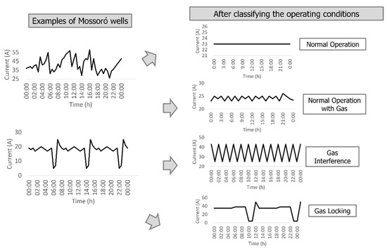 The developed algorithm showed the graph of electric current versus time of a well for 30 days and it was possible to select which time interval some operating condition was seen. To maintain a standard of identification of operating conditions, 24 h stretches were selected. The four operating conditions obtained were trained on a test dataset, using an ML algorithm.