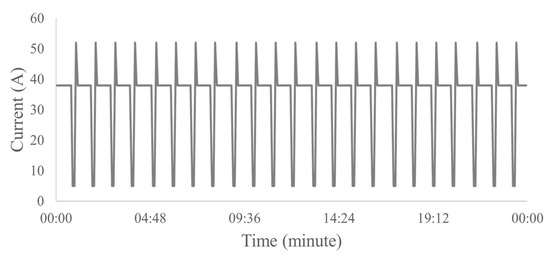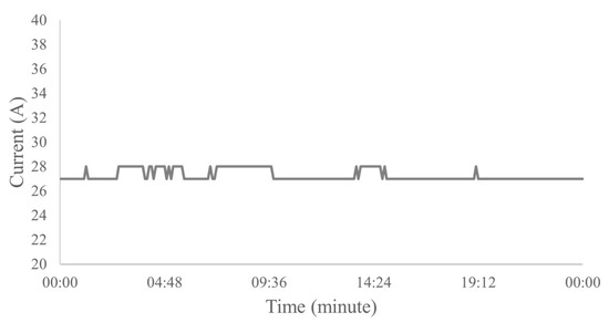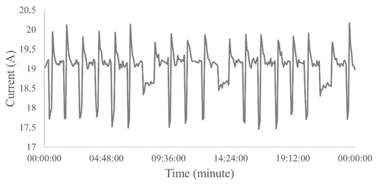 The electric current versus time graph of the normal operating condition is smooth, however, this condition may produce a curve slightly above or below the ideal amperage of this operation, but this generated deviation from the curve does not prevent the system from working properly. According to engineers in the area, to classify normal operation, a constant pattern of electric current over time or peaks with variation of up to 1 A (Figure 5) was observed, which is considered a well with practically no electric current fluctuations.