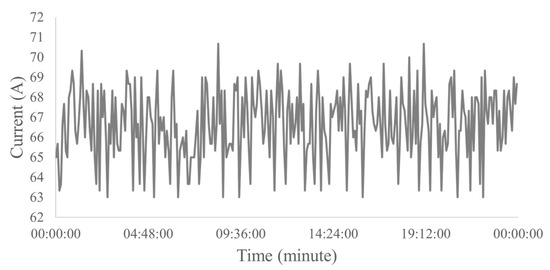 Normal gas operation was studied as it is a striking feature in the wells analyzed in this work. Therefore, according to engineers in the area, for wells with normal operation with gas, reference standards for electrical current ranging from 1 A to 5 A. This condition of the pump operating with a low amount of gas does not affect the production system, and the well disarm is not triggered. Figure 6 presents an example of a dataset of normal operation with gas used in the work.