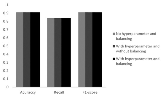 As in the previous models, the library used for training the datasets in the SVM algorithm was scikit-learn and the function applied was svm.SCV. In the tests of this model, three algorithms were performed. It started with a simple model with the data still unbalanced and without hyperparameter adjustment. In this case the accuracy was 80%. Later, the application with hyperparameters and with datasets unbalanced, had an accuracy of 93%. The latter used hyperparameters and balanced data and had an accuracy of 83%. The criteria analyzed for each condition mentioned are shown in Figure 11. Table 6 shows all the parameters of the algorithm with the best accuracy.