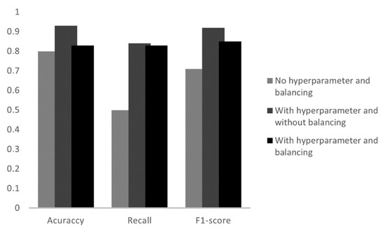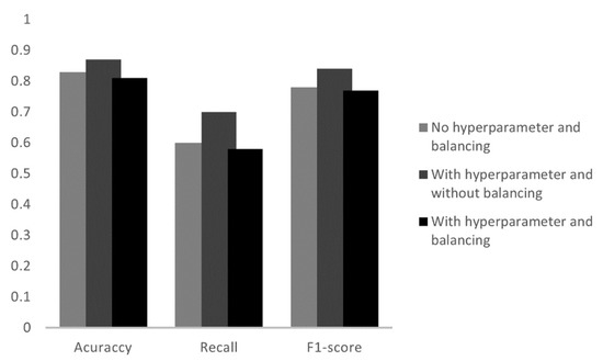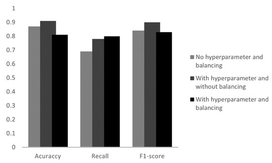 At the stage of algorithm selection, initially, no adjustment or manipulation was performed to improve the performance of the algorithm. Furthermore, in this work, algorithms with an increasing order of complexity were applied. The initial algorithms were executed without hyperparameter tuning or balanced data. After this test, hyperparameter tuning (Grid Search) and data balancing were applied, using the oversampling technique in the algorithms.