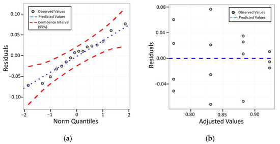 It is possible to analyze in Figure 13a that the residuals are normally distributed according to the Anderson–Darling normality test (n = 16; AD = 0.201 and p-value = 0.856). Figure 13b proves that the residuals are well distributed along the zero axis, declaring that the data are acceptable for using ANOVA. In ANOVA, the p-value was verified, which must be less than or equal to the 5% significance level. In the case of this work, the p-value = 0.00428. Therefore, it is concluded that there is a high correlation between the data of this article and this value is very strongly against the null hypothesis.