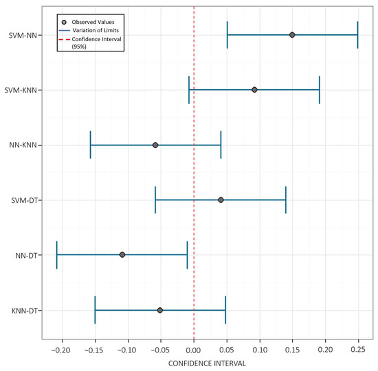 Differences between classification algorithms (DT, KNN, SVM and NN) based on confidence interval (95%).