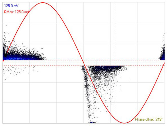 At first, a PD measurement under AC voltage was carried out to characterize the type of discharge associated with the faulty cable. This experiment was performed with a gradually increasing voltage to determine the value of the PD Inception Voltage (PDIV) under AC stress. The HFCT sensor is clamped around the ground cable. During the test, it turned out that the magnitude of the applied voltage that caused PDs was 8.2 kV, which corresponds to the PDIV. To identify the type of PD and the noise level acquired during the test, the phase-resolved partial discharge (PRPD) of the HFCT sensor, reported in Figure 8, should be analyzed. Hence, more than 3000 pulses of PDs were acquired to obtain statistically significant results. The red curve in the pattern is the reference of the AC-applied voltage and is useful for defining the phase of the acquired PDs. The reported PRPD patterns have been extracted from the PryCam Grids acquisition software available in the lab. As can be seen from its shape, the specimen exhibits the presence of internal discharges. It is worth noting that all the measurement sensors used in this experiment (i.e., spiral, non-spiral, and meander) exhibit a PRPD similar to that of the HFCT. It is well known that internal PD is the most common leading cause of premature insulator failure in power cables. This proves the defective aspect of the used cable, since air microcavities are trapped in the dielectric material and, therefore, when the insulator is subjected to an external electric field, a difference is created between the electric field of the air present in the microcavity and that of the surrounding dielectric layer.