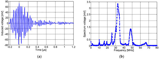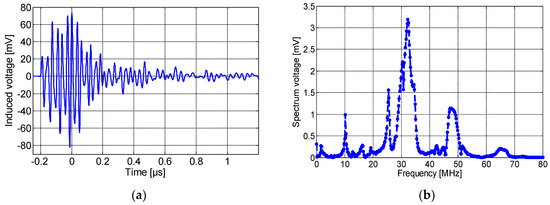 Figure 10a,b show, respectively, the induced voltage waveform detected by the non-spiral inductor and its frequency spectrum. As seen here, the maximum amplitude was about 500 mV with a rise time of 0.22 µS. It is worth noting that the resulting pulse detected by the non-spiral sensor presents an offset of ~75 mV, and this is most likely due to the presence of low-frequency (50 Hz) content noise. The spectrum frequency shows a main peak at ~32 MHz. Lastly, Figure 11a,b show, respectively, the induced voltage signal detected by the meander sensor and its spectrum frequency. The maximum amplitude of the detected PD pulse was approximately 80 mV. The frequency spectrum of the detected signal, shown in Figure 11b, displays the fundamental peak at ~32 MHz. It could be clearly noted that the meander sensor exhibits the lowest sensitivity for PD detection and the lowest number of oscillations (lower PD pulse duration), while the non-spiral inductor presents the highest sensitivity with almost a single-frequency spectrum.