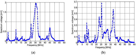 Position 3 (P3 in Figure 6): In this position, the three sensors were placed on the ground wire. Figure 14 and Figure 15 show the induced voltage of the PD pulse and its frequency spectrum detected by the spiral, non-spiral, and meander sensors. Results show that the spiral sensor detects a maximum amplitude of about 30 mV (Figure 14a) and presents a main spectrum frequency peak at 18 MHz (Figure 14b), while the non-spiral sensor presents a maximum pulse amplitude of 45 mV. The non-spiral sensor shows a main frequency band starting at 25 MHz and going up to 45 MHz (Figure 15a), which corresponds to the frequency band of the PD signal detected by the non-spiral sensor. The frequency components beyond 32 MHz are comparatively small. Lastly, the maximum amplitude of the PD pulse detected by the meander sensor was about 18 mV, and the frequency spectrum of the signal detected shows the main frequency components at 25 MHz and 37 MHz (Figure 15b). Again, as can be noted, the non-spiral sensor presents a higher sensitivity of PD detection than the spiral inductive sensor in both positions, and it presents a smaller number of oscillations in the signal than the spiral sensor. It is clearly noted that the meander sensor presents the lowest sensitivity for PD detection compared to the spiral and non-spiral sensors in the two positions.