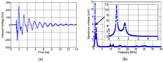 (a) The time-domain wave due to partial discharges at 8.2 kV, and (b) its frequency spectrum, detected by the inductive spiral sensor placed at P1.