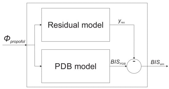 The residual dynamic model is identified based on the data measured during a medical procedure treating an individual patient. The input of the residual dynamic model is the actual propofol inflow , whereas its output is obtained by subtracting the actual measured BIS signal from the population-data-based model output , as shown in Equation (8). The latter is calculated according to the predefined population-data-based PK and PD model, taking into account the individual patient’s properties.