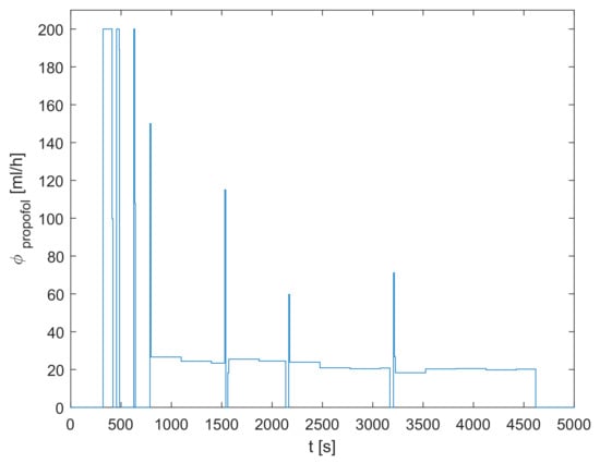 The signal denoting the inflow of propofol was parsed from the clinically recorded data and is shown in Figure 2. One can see that, firstly, a bolus dose is introduced in order to rapidly increase the concentration of propofol in the body. This phase is called the induction of anesthesia and results in the patient losing consciousness. Later, a suitable dose of propofol is continuously administered in order to keep the proper anesthetic depth.