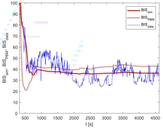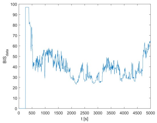 BIS index is a noninvasive measurement method. A BIS monitor is connected to electrodes on the patient’s head and the bispectral index is calculated from the measured EEG signals. The BIS monitor provides a single dimensionless number, which ranges from 0 (equivalent to EEG silence) to 100. A BIS value between 40 and 60 indicates an appropriate level for GA, whereas a value below 40 is appropriate for long-term sedation due to head injuries. The reference can thus be set to the applicable value; the manner and speed of approaching the reference value depend on the specific characteristics of the procedure and the pharmacokinetics and pharmacodynamics of the substance in the patient’s body. The BIS value can, therefore, be considered as a representation of the DoH, although some papers question the relevance of BIS measurement for representing hypnosis as a graded state during surgery [,]. The authors in [] pointed out the poor correlation between BIS and serum concentrations of propofol, which calls into question the relevance of the BIS measurement in representing hypnosis as a graded state during surgery. When they included all values during anesthesia, there was a significant correlation between BIS and serum propofol, but the correlation was poor and disappeared when the outliers were removed. Their results do not seem to support the idea that BIS represents a continuous measure of DoH, assuming that elevated serum concentrations of propofol correspond to deeper hypnotic levels. However, because they have too few data points to test the correlation between serum concentration and BIS in individual patients, the reason could be that there are interindividual differences in sensitivity to propofol. They noted that a correlation could exist in a single patient but is not evident in data from many subjects.