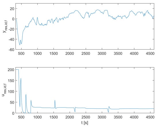 In Equations (22)–(24), denotes the covariance matrix (), where n represents the length of the regressor. denotes the vector of the identified or estimated process parameters, denotes the forgetting factor, and I is the unity matrix, where . The recursive parameter estimation is carried out online—in every time step t—and returns the calculated parameters of the model .