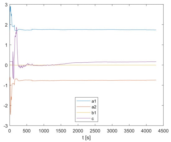 As the recursive parameter estimation is carried out, the parameters , and c change their values along the trajectories shown in Figure 5.