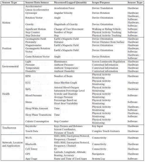 Mobile devices and appliances such as various wearables, handheld smartphones, or tablets feature certain sensors that collect a large amount of personal information for a variety of scenarios and purposes [1,2]. Additionally, the significant increase of wearables’ computational capabilities makes them suitable for many real-world uses [3,4]. The ubiquitous availability of the mobile devices makes them obvious targets for cyberattacks designed to illegitimately gain access to personal data and resources [5].