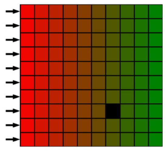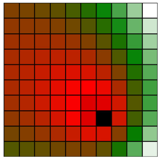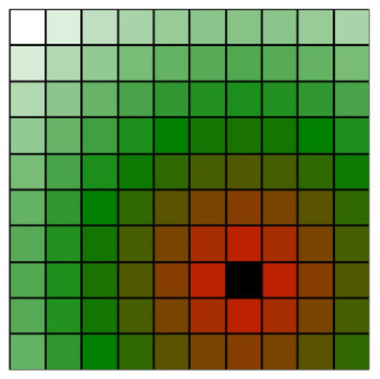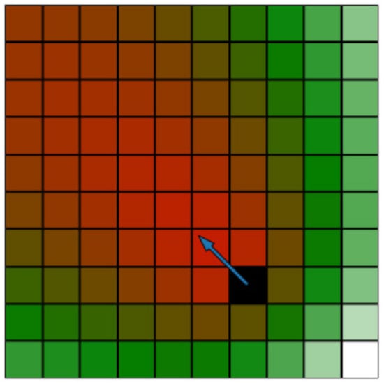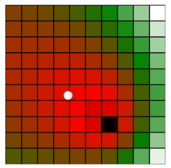 Simplified 2D visualization of the total classification index of voxels around an obstacle (the black voxel).
