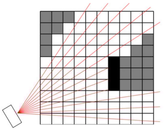 To find the voxels that are visible to the camera, we cast a ray from the camera origin through each individual pixel of the camera image. Every voxel intersected by some ray is considered visible; see an example in Figure 6, where visible voxels are drawn as white squares and invisible as grey squares. Grey squares represent parts of the workplace that cannot be monitored by the camera. If there is an obstacle (e.g., the robot) in the workspace, the voxels containing the obstacle (black squares in Figure 6) block the rays and, thus, the voxels behind the obstacle are also considered invisible.
