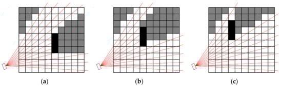 Camera coverage of a voxel map with a moving obstacle (black voxels) during three time moments; (a) t1; (b) t2; (c) t3.