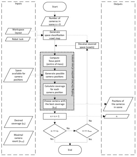 The whole algorithm of designing a camera subsystem is summarized by the flowchart in Figure 9. The process starts by generating the space classification voxel map according to Section 2, where each voxel has an importance index value that describes its importance for monitoring. This first step depends on the description of the workspace layout, the robot task and on the chosen definition of classification functions; see Equations (1)–(5).