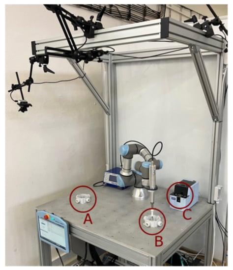 Experimental workplace with the UR3 robot; letters A and B denote the assembly stations, letter C denotes the supply feeder.