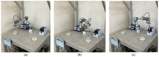 Target positions of the UR3 manipulator during the work cycle: (a) assembly station A; (b) assembly station B; (c) supply feeder at station C.