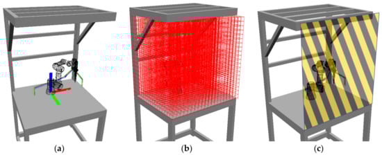 Simulation of the experimental workplace: (a) robot trajectory between stations A, B, and C; (b) voxel grid covering the workspace volume (voxel size is 5 cm); (c) operator access plane to the workplace.