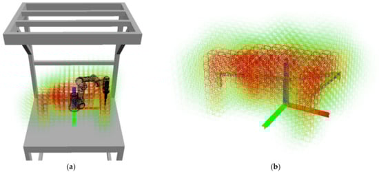 Visualization of the total classification index of voxels in the workplace: (a) overall view; (b) detail (the coordinate system represents the location of the robot base).