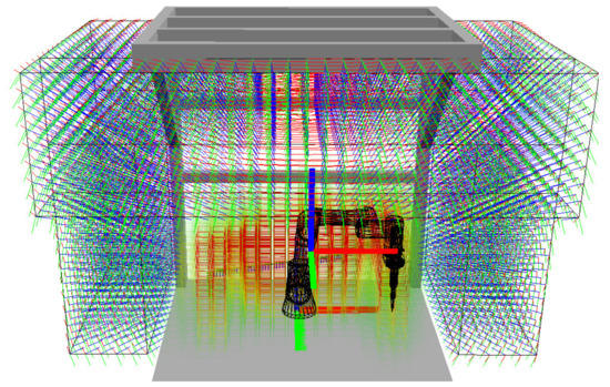 All possible locations for cameras are generated inside these bounding boxes in a grid with a chosen spacing of 5 cm in axes x, y and z. The resulting positions and orientations of all possible cameras are shown using the small coordinate systems in Figure 15; the blue axes represent the view directions of cameras towards the centre of gravity of the classified voxel map (represented by the large coordinate system).