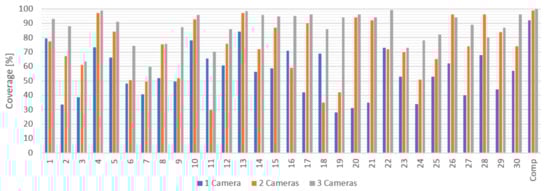 The very best results achieved by the subjects were 84.1% for one camera (subject number 13), 97.2% for two cameras (subject number 4), and 99% for three cameras (subject number 22). Figure 18 shows the achieved relative coverage values for each individual subject and for the automated system.