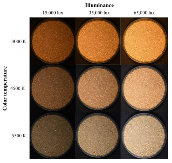 Figure 5 and Figure 6 show digital images of Yongin soil and Gwanak soil, respectively, taken under three different illuminance (15,000 lux, 35,000 lux, and 65,000 lux) and color temperature (3000 K, 4500 K, and 5500 K) conditions. Even though the identical soil samples were photographed using the same camera settings, the soil color displayed on the image varied greatly depending on the light conditions. This is because, as described above, when the incident light is changed according to the color expression principle, the reflected light that determines the color also changed.