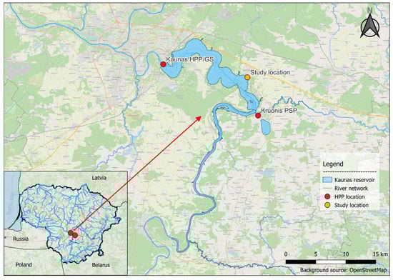 The Kaunas HPP reservoir is the largest artificial water body in Lithuania. The reservoir was created by damming the Nemunas River in 1959. The reservoir is used by two large hydropower plants—the Kaunas Hydropower plant, which has an installed capacity of 101 MW and a rated head of 20.1 m, and the Kruonis Pumped Storage Hydropower Plant (PSP), which currently has an installed capacity of 900 MW from four turbines and a rated head of 93.6–111.5 m (depending on the water level in the upper reservoir). The Kaunas HPP reservoir is mainly used for power generation but is also used for recreation, navigation, irrigation, industrial water supply, flood management, and recreational fishing. Water level fluctuations in the Kaunas HPP reservoir are mostly dependent on power plant operation and the upstream inflow from the Nemunas River. The impounded area of the Kaunas HPP reservoir at a normal water level (NWL) is 63.5 km2 and the volume is 0.46 km3. The effective capacity of the reservoir available for hydropower is 0.22 km3. The average depth of the Kaunas HPP reservoir is 7.3 m, and the depth of the reservoir is 10–12 m in the lower part and about 4–5 m in the upper part [32].