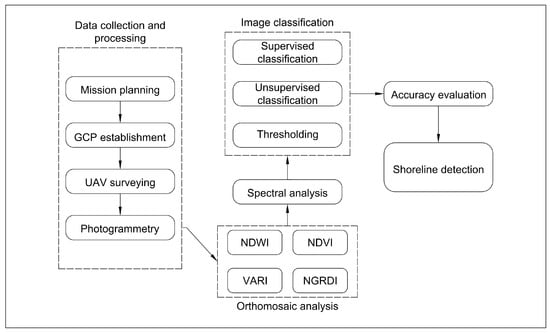 Raster images containing NDVI and VARI indices were not segmented using supervised classification as these indices did not improve the results in the first part of the study (Section 2.2.2). The results of traditional surveying and remote sensing were compared. The shorelines were determined from the DEMs that were generated from data collected in the traditional bathymetric survey. The methodology and the short description of the study are provided in Section 1. A flowchart of the UAV data collection and shoreline detection in the potential fish spawning sites is presented in Figure 2.