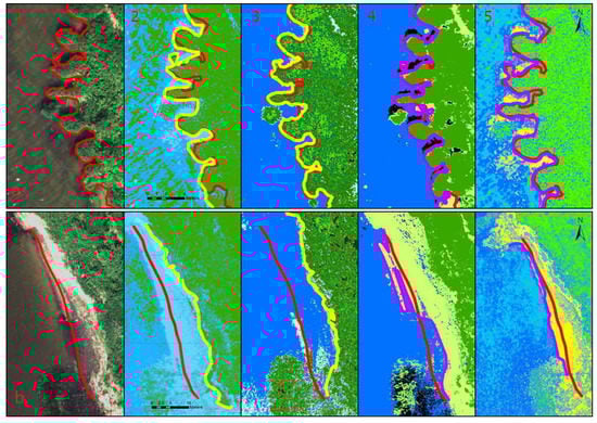 The resulting raster images of various indices were thoroughly analyzed. The index values of four different surface conditions in the study area were compared. The thresholding technique was used to segment images into several classes—water, aquatic macrophytes, land vegetation, and sand. Generally, a threshold limits can be selected by trial and error (manually) or using the peak–valley method of histogram segmentation [35]. In this instance, index value limits were set manually for each surface. The resulting segmented images were used to detect the shorelines.