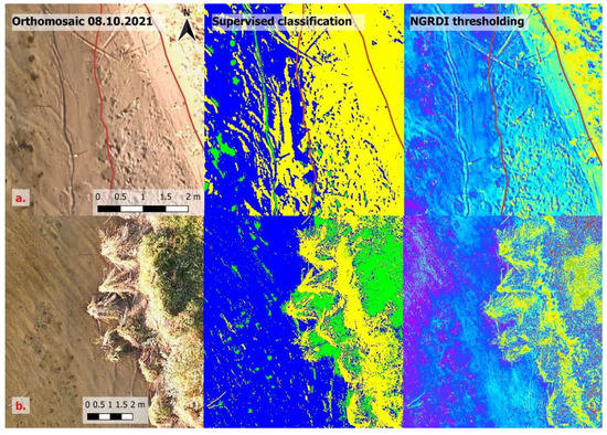 Shoreline detection using supervised classification of orthomosaic and NGRDI thresholding for different shore conditions: (a)—shallow sandy shores; (b)—steep banks covered with land vegetation.