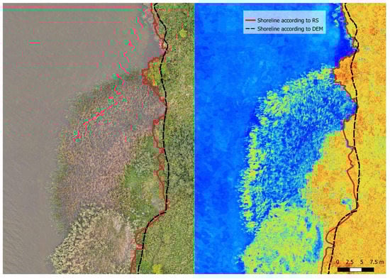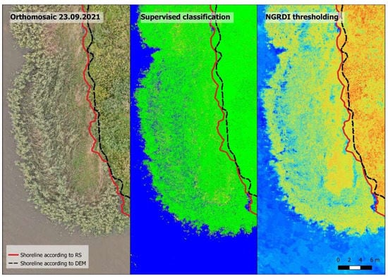When the density of aquatic vegetation is high (in this case, areas with dense and high reeds), it is very difficult to detect the shoreline using RS techniques. Dense aquatic macrophytes almost completely obstruct the water. There were not many pixels indexed as water and judging the location of the shoreline was very difficult. The thresholding of NGRDI allowed for better separation of the surfaces, but in these cases, the shoreline could only be approximated.