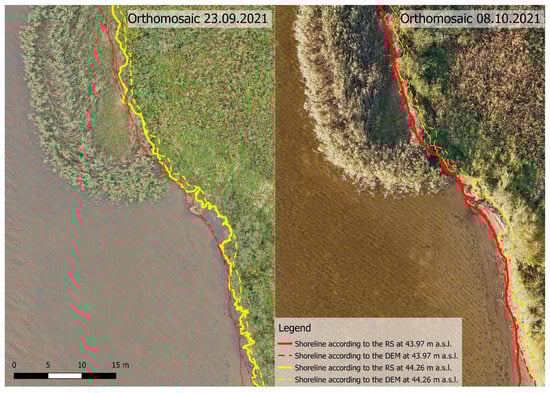 The shorelines derived from bathymetric measurements (according to the generated DEM) and RS were compared (Figure 7).