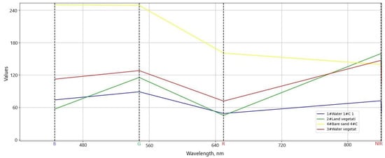A spectral signature analysis was carried out for the orthomosaic image captured with the multispectral camera (Figure 8).