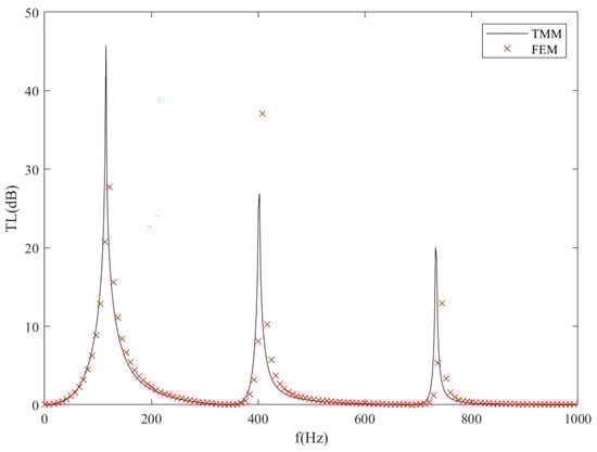 The finite element method (FEM) simulations are performed by commercial software COMSOL Multiphysics to validate the accuracy of the transmission loss results of the analytical model. The parameters of the ITEC model in this validation case are listed in Table 1. The transmission loss results of the frequency domain between 1 and 1000 Hz are shown in Figure 2. It can be seen that the ITEC has three resonance frequencies in the selected frequency domain. The TMM results match the FEM results well, especially near the first transmission loss peak. The frequencies corresponding to transmission loss peaks are listed in Table 2. It could be seen that the transmission loss peaks have a maximum error of 10 Hz near the second peak and a minimum error of 4 Hz near the first peak. In general, the analytical model has relatively high accuracy.