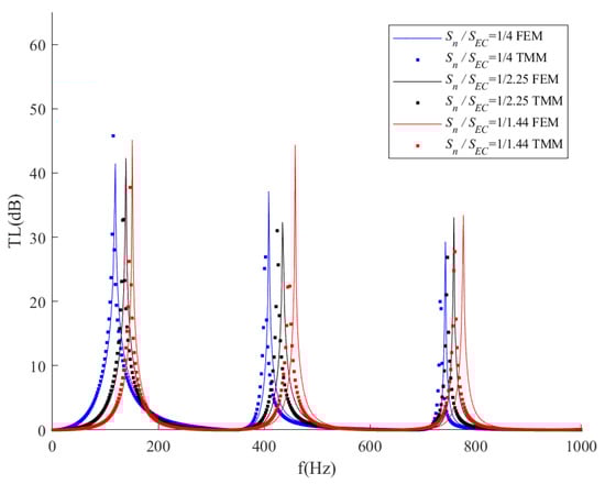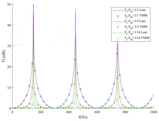 As shown in Figure 3, the solid lines represent the transmission loss of ITs with L2 = 1.15 m and various S2/SM ratios. At the same time, ITs with the same geometries are used to examine the transmission loss by Equation (15). Figure 3 illustrates a good agreement between the analytical model from the second part and from the research conducted by Lato et al. [19]. The results indicate that Equation (15) could predict the IT transmission loss.