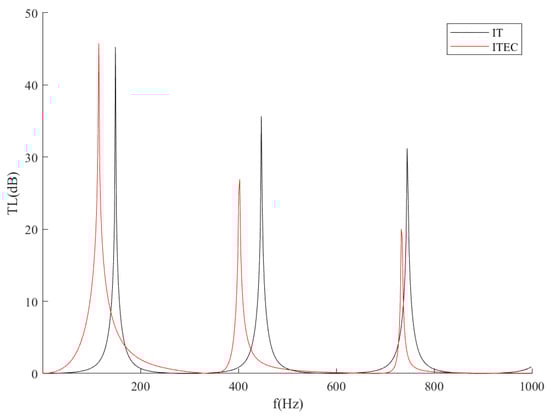 A comparison of the transmission loss between the IT and ITEC is carried out to examine the noise attenuation ability of the ITEC. The parameters of the ITEC are the same as the geometric model of Table 1, and the IT parameters are selected as the S2/SM = 1/4 case in Figure 3, which indicates that IT has the same cross-section area as the neck of the ITEC.