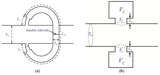 The Helmholtz resonator is widely used as a muffler for ductwork systems in industry [8]. To further examine the noise attenuation ability and assess the potential in the industrial application of the ITEC, a comparison of the transmission loss between the ITEC and Helmholtz resonator system is conducted here. As illustrated in Figure 5a, if a sharable sidewall is placed at the midpoint of the ITEC, the whole system could be regarded as two curved Helmholtz resonators mounted on the same cross-section of the main duct. Cai and Mak [21] have examined the transmission loss of parallel HRs system, which is shaped as shown in Figure 5b. Figure 5a,b indicate that curved HRs are geometrically similar to the parallel HRs system. However, the ductwork system is always located in a limited space. A curved HRs system could save more space if it has the same cavity volume as a straight HRs system.