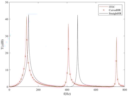 In this study, the parameters of curved HRs are the same as the ITEC in Table 1. The neck parameters of parallel HRs are LN = 95.91 mm and SN = 1418.6 mm2. The cavity volume of parallel HRs is the same as half of the chamber volume of curved HRs, which is easy to obtain from Table 1. As shown in Figure 6, the transmission loss of curved HRs is the same as the ITEC, with the same resonance frequencies and noise attenuation bandwidths. This indicates that the sharable sidewall has no impact on the noise attenuation mechanism of the ITEC. However, the transmission loss of the parallel HRs system is different. It has only two resonance frequencies from 1 to 800 Hz, while the ITEC and curved HRs have three. In addition, under the lower-frequency domain (1–350 Hz), the resonance frequency of parallel HRs is 133 Hz, which has an increase of 14 Hz compared with the ITEC and curved HRs; under the moderate frequency domain (350–650 Hz), the resonance frequency of parallel HRs is 473 Hz, which has an increase of 64 Hz compared with the ITEC and curved HRs. The characteristic of resonance frequencies shows that the ITEC and curved HRs are entirely different from the parallel HRs system, although they are geometrically similar. The ITEC has a lower resonance frequency than parallel HRs, which indicates that the ITEC is more suitable for reducing low-frequency noise. Furthermore, the curved shape of the ITEC and curved HRs system has an advantage in a constrained space. These characteristics indicate that the ITEC would have potential in ductwork systems.