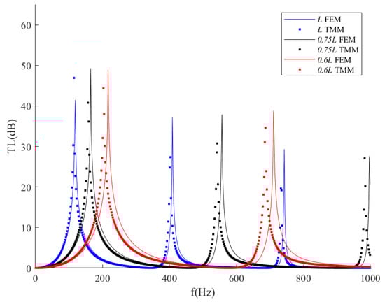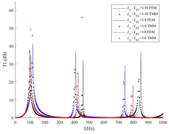 In Figure 9, we perform the transmission loss results of the ITECs with different total lengths. The total length of the ITECs is changed from 0.6 and 0.75 times to the original length (L = LEC + 2Ln = 1.15 m); LEC and Ln are also scaled down simultaneously, whereas the radii of the neck and expansion chamber have remained unchanged. As shown in Figure 9, the shorter total length would have a broader sound attenuation bandwidth. At the same time, the transmission loss peak would shift to the higher-frequency domain, even exceeding 1000 Hz, the upper limit of this research. In addition, the TMM results of 0.6 L would lead to a more significant error than the FEM results, which is due to the fact that the neck length of 0.6 L is very short. According to Ingard [22], an end correction is non-negligible for the aperture neck to improve transmission loss accuracy. For this reason, TMM in this study is not suitable for the short Ln case. Both TMM and FEM results show that the ITECs with shorter lengths would have a broader noise attenuation band. Meanwhile, the transmission loss peaks tend to shift to the higher-frequency domain. Therefore, the ITECs with shorter lengths would have better noise attenuation performance but are not suitable for low-frequency noise reduction. The transmission loss peak (TLmax) and the resonance frequency (f0) of ITECs with different geometric parameters are summarized in Table 5.