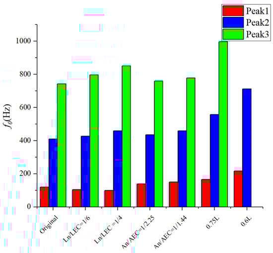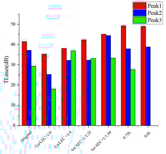 Figure 10 illustrates the influence of different geometric parameters of ITEC on the TLmax. It can be seen that changing the length ratio leads to a change of 19 dB in the TLmax in higher-frequency domain and a change of 11.8 dB in the TLmax in moderate frequency domain. Changing the cross-section area ratio has a change of 12.1 dB in higher-frequency domain. Changing the total length has a change of 7.8 dB in lower-frequency domain. Therefore, adjusting the length ratio and the cross-section area ratio are beneficial for improving the higher- and medium-frequency noise attenuation ability, and adjusting the total length is useful for improving the lower-frequency noise attenuation ability. Figure 11 illustrates the influence of different geometric parameters of ITEC on f0. Changing the total length has more of a significant impact on the resonance frequency than changing the length ratio and the cross-section area ratio. The f0 under three peaks has an increase of 98, 302, and 254 Hz. This indicates that adjusting the total length is an effective way to control the frequency of noise reduction.