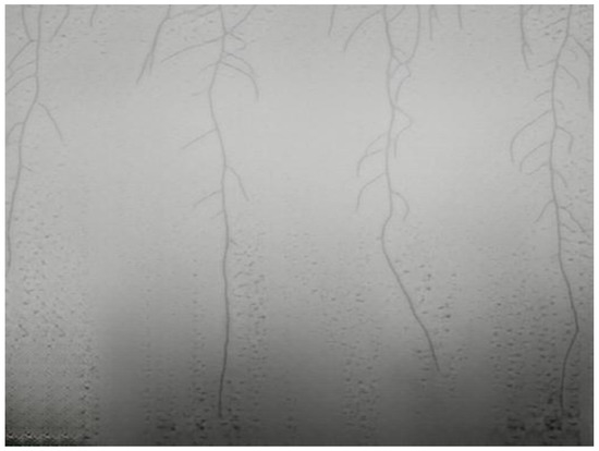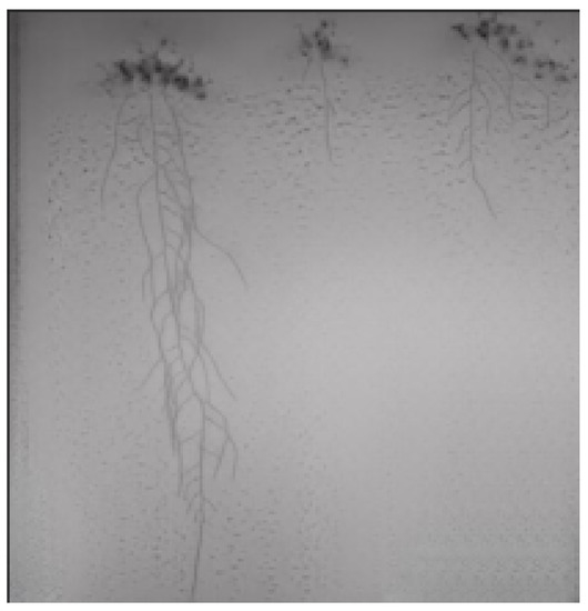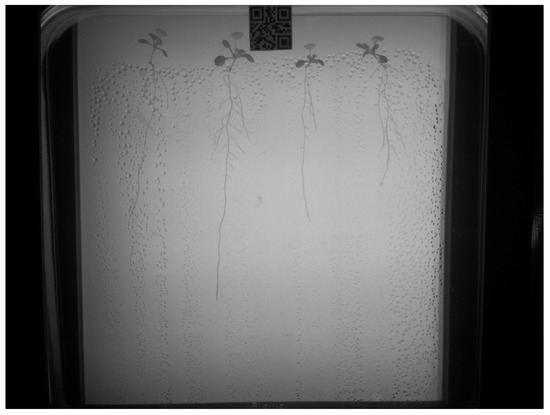 We use the dataset from the root segmentation challenge and the research conducted by the authors of [3]. The authors’ dataset consists of Arabidopsis thaliana plants growing in controlled, indoor environment inside clear gel Petri boxes. The growing periods varied between two and four weeks, and each Petri box contained four Arabidopsis thaliana plants. The authors used Raspberry Pi and four infrared cameras to capture RGB image frames of the plants’ roots growth over time in near-infrared lighting every twelve hours. An example of the growing conditions captured by the RGB camera used is seen in Figure 1. The resolution of each image is 3280 × 2464.