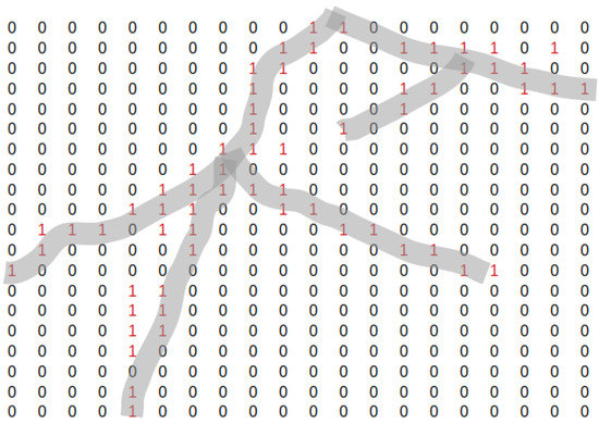 An illustrative example of semantic label map on a patch of a root image. The patch example is seen as a matrix, where indices with the value of 0 correspond to the background class and those with the red value of 1 correspond to the root class. Since the width of roots’ annotations is between 1 and 3 pixels, we highlight the red indices here in light gray so the form of the root is clearly visible.