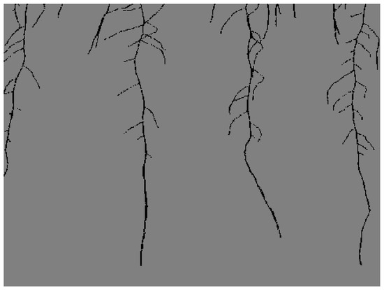 Using our trained Pix2PixHD cGAN, we generated an additional 396 images to augment our original 198 root image dataset. An example of a generated image and its corresponding annotation is shown in Figure 7 and Figure 8, respectively. Our generated images show that the Arabidopsis thaliana roots are similar to our original dataset as seen in Figure 1. Additionally, since our original annotations only contain annotated root pixels and considered the leaves as background, the generated images do not perfectly translate the Arabidopsis thaliana leaves. This is acceptable as we are mainly interested in generating photorealistic root images similar to our original dataset and in semantically segmenting the RSA from the background.