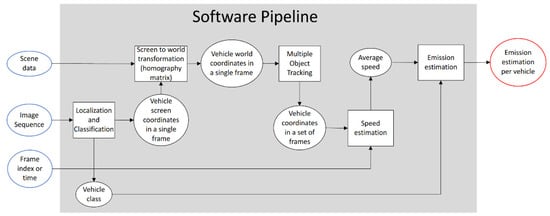 Diagram representing the logical structure of the pipeline that takes a sequence of images and computes an estimate of emissions for each vehicle.