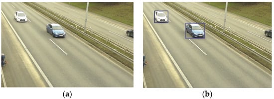 Object localisation performed by YOLOv5 nano: (a) input image; (b) the result bounding boxes over the vehicles.