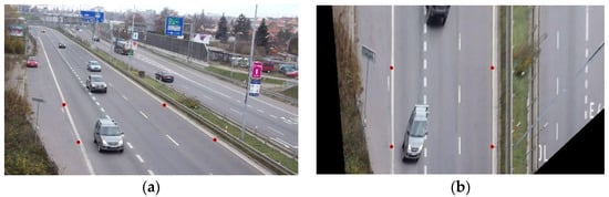 Coordinates transform: (a) an input image with the 4 points marked; (b) the result of applying the transformation to all the pixels of the image. Note that the road has lost its perspective, and it looks like it is seen from above, while the cars are deformed because they do not belong to the characterised road plane.