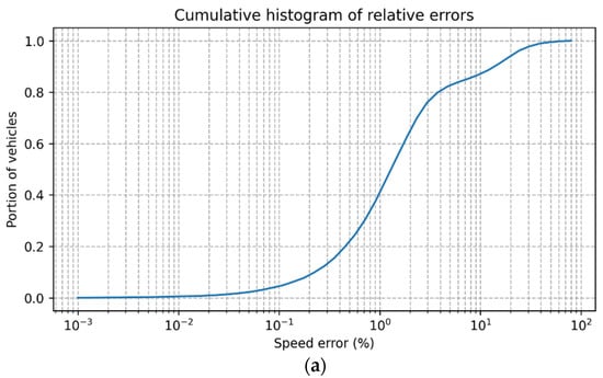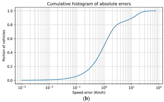 Cumulative histograms that show the distribution of the speed error (logarithmic scale) when compared to the ground truth: (a) plot of relative errors; (b) plot of absolute errors.