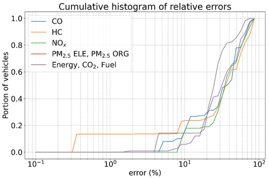 Cumulative histograms of errors of emission estimations based on the speed estimations computed by our system.